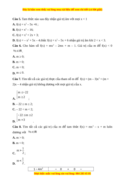 Đây là bản xem th , vu ử i lòng mua tài li u ệ đ xe ể m chi ti t (c ế ó l i ờ gi i ả ) Câu 5. Tam th c nào ứ sau đây nh n ậ giá tr âm ị v i ớ m i ọ x < 1