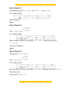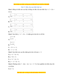 Đây là bản xem th , vu ử i lòng mua tài li u ệ đ xe ể m chi ti t (c ế ó l i ờ gi i ả ) Bài 17. Dấu c a t ủ am th c b ứ c hai ậ Câu 1. B ng ả xét d u ấ nào sau đây là b ng ả xét d u ấ c a ủ tam th c ứ f(x) = x2 + 12x + 36 là: A. ; B. ; C. ; D. . Câu 2. Tam th c y = x ứ 2 – 12x – 13 nh n ậ giá tr âm ị khi và ch khi ỉ x –13 A. x 1 ; x –1 B. x 13 ;