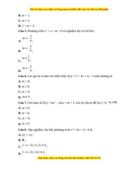 ứ (x) = x2 + 4x + m – 5 luôn dư ng l ơ à: A. m < 9; B. m ≥ 9; C. m > 9; D. m .