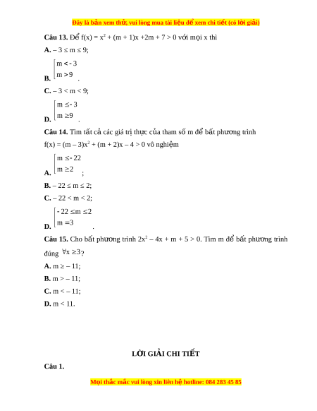 ơ trình 2x2 – 4x + m + 5 > 0. Tìm m để b t ấ phư ng ơ trình đúng x 3 ? A. m ≥ – 11; B. m > – 11; C. m < – 11; D. m < 11. LỜI GIẢI CHI TI T Ế Câu 1. M i