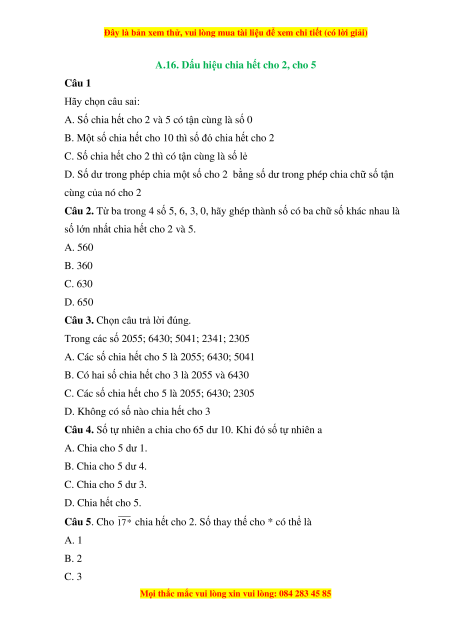 A.16. Dấu hiệu chia hết cho 2, cho 5 Câu 1 Hãy chọn câu sai: