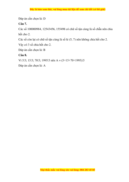 Câu 8. Tổng chia hết cho 5 là A. A = 5+15+70+1995 B. B = 10+25+34+2000 C. C = 25+15+33+45 D. D = 15+25+1000+2007