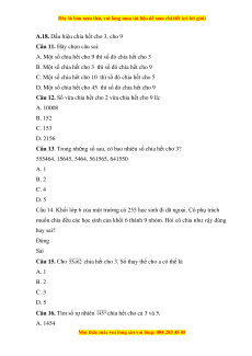 Câu 18. Các số có tổng … chia hết cho 3 thì chia hết cho 3 và chỉ những số đó mới chia hết cho 3. A. các chữ số B. tổng các chữ số C. các số D. chữ số tận cùng