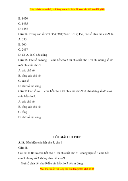 Câu 17. Trong các số 333; 354; 360; 2457; 1617; 152, các số chia hết cho 9 là A. 333 B. 360 C. 2457 D. Cả A, B, C đều đúng