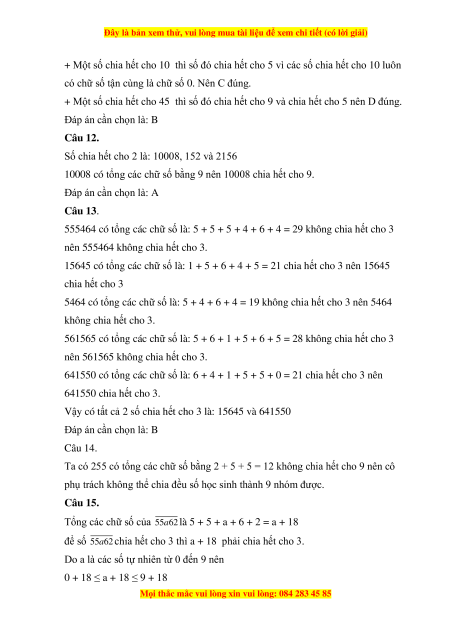 + Một số chia hết cho 45 thì số đó chia hết cho 9 và chia hết cho 5 nên D đúng. Đáp án cần chọn là: B Câu 12.