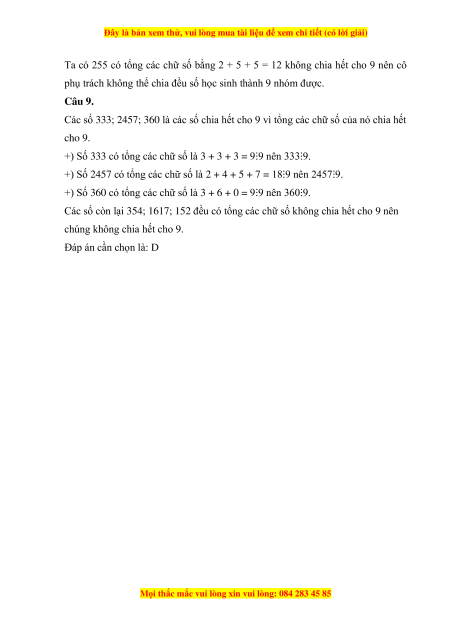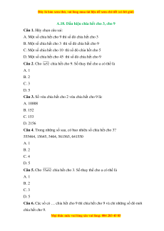 Câu 9. Trong các số 333; 354; 360; 2457; 1617; 152, các số chia hết cho 9 là A. 333 B. 360 C. 2457 D. Cả A, B, C đều đúng