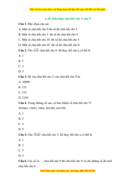A.18. Dấu hiệu chia hết cho 3, cho 9
