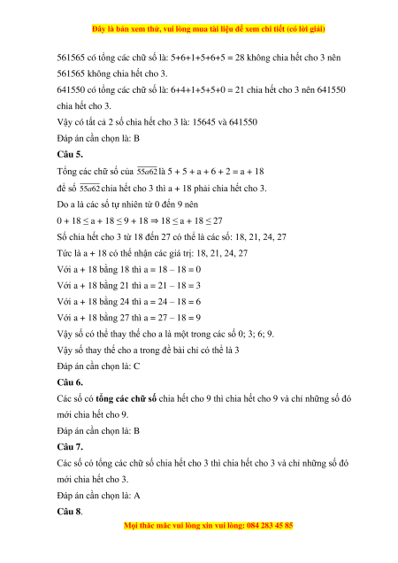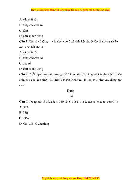 Câu 7. Các số có tổng … chia hết cho 3 thì chia hết cho 3 và chỉ những số đó mới chia hết cho 3. A. các chữ số B. tổng các chữ số C. các số D. chữ số tận cùng