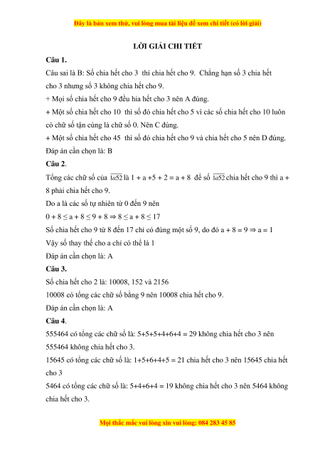 + Một số chia hết cho 45 thì số đó chia hết cho 9 và chia hết cho 5 nên D đúng. Đáp án cần chọn là: B Câu 2.