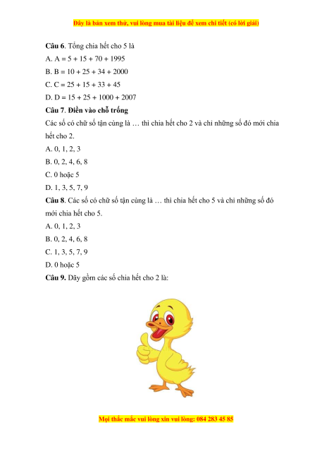 Câu 6. Tổng chia hết cho 5 là A. A = 5 + 15 + 70 + 1995 B. B = 10 + 25 + 34 + 2000 C. C = 25 + 15 + 33 + 45 D. D = 15 + 25 + 1000 + 2007