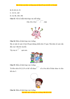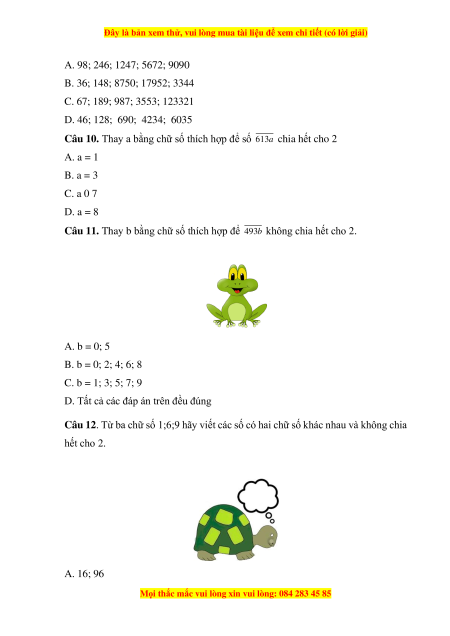 Câu 11. Thay b bằng chữ số thích hợp để 493b không chia hết cho 2. A. b = 0; 5 B. b = 0; 2; 4; 6; 8 C. b = 1; 3; 5; 7; 9