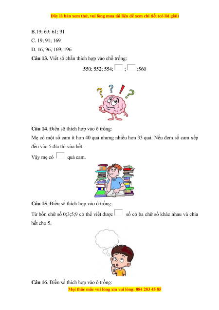 Câu 13. Viết số chẵn thích hợp vào chỗ trống: 550; 552; 554; ; ;560