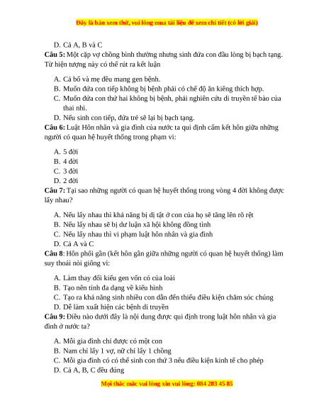 dị tật ở con của họ sẽ tăng lên rõ rệt, nếu lấy nhau thì vi phạm luật hôn nhân và gia đình Đáp án cần chọn là: D Câu 8: