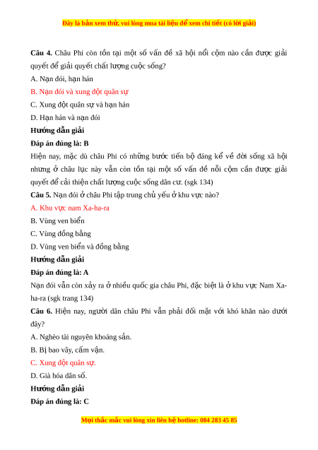 Câu 4. Châu Phi còn t n ồ t i ạ m t ộ số v n ấ đề xã h i ộ n i ổ c m ộ nào c n ầ đư c ợ gi i ả quy t ế để gi i ả quy t ế ch t ấ lư ng cu ợ c ộ s ng? ố A. N n ạ đói, h n hán ạ B. N n đói ạ và xung đ t ộ quân s ự C. Xung đ t ộ quân sự và h n hán ạ D. H n ạ hán và n n ạ đói Hư ng d ớ ẫn gi i ả Đáp án đúng là: B Hi n ệ nay, m c ặ dù châu Phi có nh ng ữ bư c ớ ti n ế bộ đáng kể về đ i ờ s ng ố xã h i ộ nh ng ư ở châu l c ụ này v n ẫ còn t n ồ t i ạ m t ộ số v n ấ đề n i ỗ c m ộ c n ầ đư c ợ gi i ả quy t ế để c i ả thi n ch ệ t ấ lư ng cu ợ c ộ s ng dân c ố . ( ư sgk 134) Câu 5. N n ạ đói châu Phi ở t p ậ trung ch y ủ u ế khu v ở c nào? ự A. Khu v c ự nam Xa-ha-ra B. Vùng ven bi n ể C. Vùng đồng b ng ằ D. Vùng ven bi n và đ ể ồng b ng ằ Hư ng d ớ ẫn gi i ả Đáp án đúng là: A N n ạ đói v n ẫ còn x y ả ra ở nhi u ề qu c ố gia châu Phi, đ c ặ bi t ệ là ở khu v c ự Nam Xa- ha-ra (sgk trang 134) Câu 6. Hi n ệ nay, ngư i ờ dân châu Phi v n ẫ ph i ả đ i ố m t ặ v i ớ khó khăn nào dư i ớ đây?