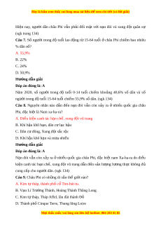 Câu 3. Dân c châu Phi ư có đ c ặ đi m ể nào sau đây? A. C c ơ ấu dân số tr v ẻ i ớ số dân trong và dư i ớ tu i ổ lao đ ng chi ộ m ế t l ỉ cao. ệ B. Dân số ít, c c ơ u dân s ấ ố già C. Dân số trong đ t ộ u i ổ lao đ ng ộ chi m ế t l ỉ r ệ t ấ nh . ỏ D. C c ơ ấu dân số già v i ớ đ c đi ặ m ể dân số trong đ t ộ u i ổ lao đ ng t ộ ăng Hư ng d ớ ẫn gi i ả Đáp án đúng là: A Châu Phi có cơ c u ấ dân số trẻ v i ớ số dân trong và dư i ớ tu i ổ lao đ ng ộ chi m ế t ỉlệ cao. Năm 2020, số ngư i ờ trong độ tu i ổ 0-14 tu i ổ chi m ế kho ng ả 40,6% số dân và số ngư i ờ trong độ tu i ổ 15-64 tu i ổ chi m ế 55,9% s dân. ( ố sgk trang 134) M i ọ thắc m c