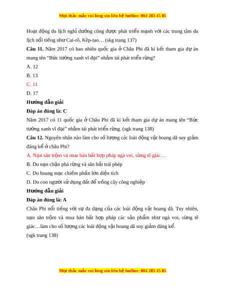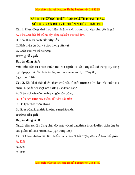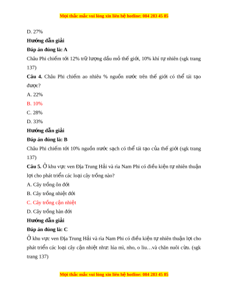 ệ otline: 084 283 45 85 D. 27% Hư ng d ớ ẫn gi i ả Đáp án đúng là: A Châu Phi chi m ế t i ớ 12% tr ữ lư ng ợ d u ầ m ỏ th ế gi i ớ , 10% khí t ự nhiên (sgk trang 137) Câu 4. Châu Phi chi m ế ao nhiêu % ngu n ồ nư c ớ trên thế gi i ớ có thể tái t o ạ đư c ợ ? A. 22% B. 10% C. 28% D. 33% Hư ng d ớ ẫn gi i ả Đáp án đúng là: B Châu Phi chi m ế t i ớ 10% ngu n ồ nư c ớ s ch ạ có th ể tái t o ạ c a ủ th ế gi i ớ (sgk trang 137) Câu 5. Ở khu v c ự ven Đ a ị Trung H i