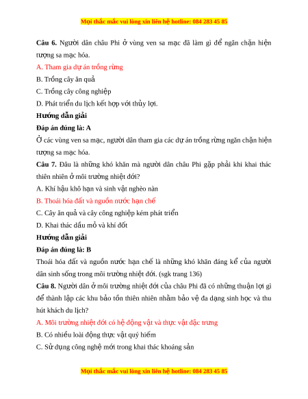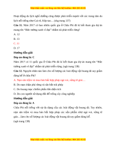 ạ đã làm gì để ngăn ch n ặ hi n ệ tư ng ợ sa m c ạ hóa. A. Tham gia d án t ự r ng r ồ ng ừ B. Trồng cây ăn quả C. Trồng cây công nghi p ệ D. Phát tri n du l ể ch k ị t ế h p v ợ i ớ th y l ủ i ợ . Hư ng d ớ ẫn gi i ả Đáp án đúng là: A Ở các vùng ven sa m c, ạ ngư i ờ dân tham gia các d án t ự r ng r ồ ng ngăn ch ừ n hi ặ n ệ tư ng ợ sa m c ạ hóa. Câu 7. Đâu là nh ng ữ khó khăn mà ngư i ờ dân châu Phi g p ặ ph i ả khi khai thác