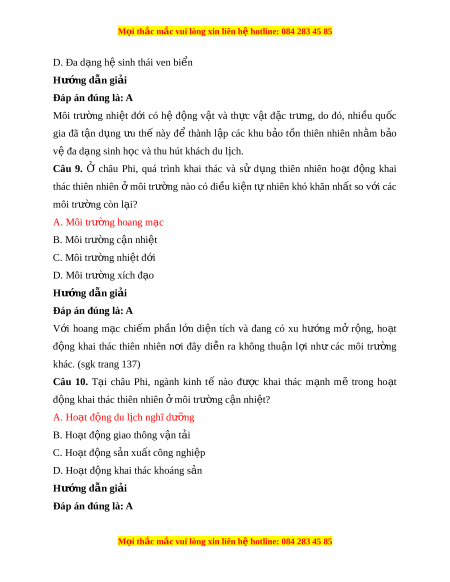 dân sinh sống trong môi trư ng nhi ờ t ệ đ i ớ . (sgk trang 136) Câu 8. Ngư i ờ dân ở môi trư ng ờ nhi t ệ đ i ớ c a ủ châu Phi đã có nh ng ữ thu n ậ l i ợ gì để thành l p ậ các khu b o ả t n ồ thiên nhiên nh m ằ b o ả vệ đa d ng ạ sinh h c ọ và thu hút khách du lịch? A. Môi trư ng ờ nhi t ệ đ i ớ có h đ ệ ng v ộ t ậ và th c ự v t ậ đ c ặ tr ng ư B. Có nhi u l ề oài đ ng t ộ h c ự v t ậ quý hi m ế C. S d ử ng công ngh ụ m ệ i