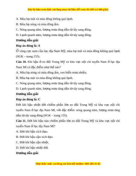 ừ ây sang đông (SGK – trang 155). Câu 11. Đ i ớ khí h u ậ nào chi m ế ph n ầ l n ớ eo đ t ấ Trung Mỹ và khu v c ự n i ộ chí tuy n N ế am l ở c đ ụ a N ị am Mĩ? A. Đ i ớ khí h u xí ậ ch đ o. ạ B. Đ i ớ khí h u c ậ n xí ậ ch đ o. ạ C. Đ i ớ khí h u c ậ n nhi ậ t ệ . D. Đ i ớ khí h u nhi ậ t ệ đ i ớ . Hư ng d ớ ẫn gi i ả M i