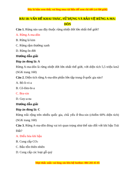 BÀI 18: VẤN ĐỀ KHAI THÁC, S D Ử N Ụ G VÀ B O Ả V R Ệ N Ừ G A-MA- DÔN Câu 1. R ng ừ nào sau đây thu c r ộ ng nhi ừ t ệ đ i ớ l n nh ớ t ấ th gi ế i ớ ? A. R ng ừ A-ma-dôn B. R ng l ừ á kim C. R ng r ừ m ậ thư ng ờ xanh D. R ng ừ ôn đ i ớ Hư ng d ớ ẫn gi i ả Đáp án đúng là: A R ng ừ A-ma-dôn là r ng ừ nhi t ệ đ i ớ l n ớ nh t ấ thế gi i ớ , v i ớ di n ệ tích 5,5 tri u ệ km2 (SGK trang 160) Câu 2. Di n t ệ ích r ng ừ A-ma-dôn ph n l ầ n t ớ p ậ trung qu ở c gi ố a nào? A. Bô-li-vi-a B. Cô-lôm-bi-a C. Bra-xin D. Guy-a-na Hư ng d ớ ẫn gi i ả Đáp án đúng là: C R ng ừ tr i ả r ng ộ trên nhi u ề qu c ố gia, chủ y u ế ở Bra-xin (chi m ế 60% di n ệ tích) (SGK trang 160) Câu 3. R ng