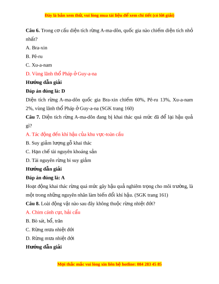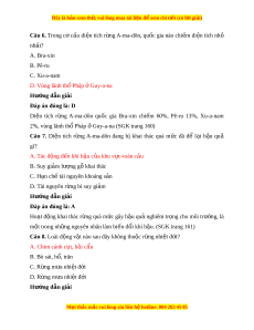 Đây là bản xem th , vu ử i lòng mua tài li u ệ đ xe ể m chi ti t (c ế ó l i ờ gi i ả ) Câu 6. Trong cơ c u ấ di n ệ tích r ng ừ A-ma-dôn, qu c ố gia nào chi m ế di n ệ tích nhỏ nhất? A. Bra-xin B. Pê-ru C. Xu-a-nam D. Vùng lãnh thổ Pháp G ở uy-a-na Hư ng d ớ ẫn gi i ả Đáp án đúng là: D Di n ệ tích r ng ừ A-ma-dôn qu c ố gia Bra-xin chi m ế 60%, Pê-ru 13%, Xu-a-nam 2%, vùng lãnh thổ Pháp G ở uy-a-na (SGK trang 160) Câu 7. Di n ệ tích r ng