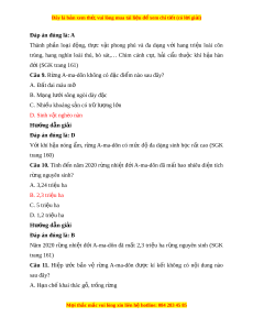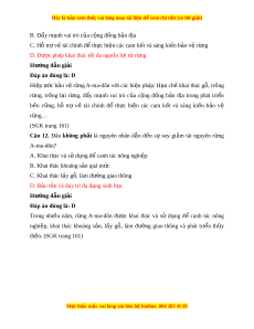 ừ A-ma-dôn không có đ c đi ặ m ể nào sau đây? A. Đất đai màu mỡ B. M ng ạ lư i ớ sông ngòi dày đ c ặ C. Nhi u khoáng s ề n có t ả r l ữ ư ng l ợ n ớ D. Sinh v t ậ nghèo nàn Hư ng d ớ ẫn gi i ả Đáp án đúng là: D V i ớ khí h u ậ nóng m ẩ , r ng ừ A-ma-dôn có m c ứ đ ộ đa d ng ạ sinh h c ọ r t ấ cao (SGK trang 160) Câu 10. Tính đ n ế năm 2020 r ng ừ nhi t ệ đ i ớ A-ma-dôn đã m t ấ bao nhiêu di n ệ tích r ng nguyên s ừ inh? A. 3,24 tri u ha ệ B. 2,3 tri u ha ệ C. 5 tri u ha ệ D. 1,2 tri u ha ệ Hư ng d ớ ẫn gi i ả