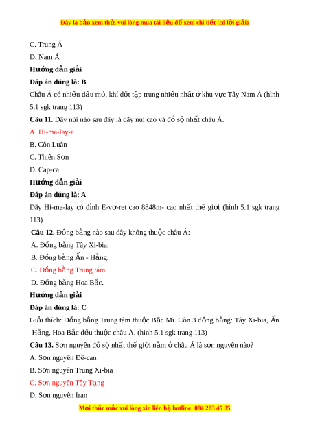 ằ nào sau đây không thu c ộ châu Á: A. Đồng b ng ằ Tây Xi-bia. B. Đồng b ng ằ n - Ấ H ng. ằ C. Đồng b ng ằ Trung tâm. D. Đồng b ng ằ Hoa B c. ắ Hư ng d ớ ẫn gi i ả Đáp án đúng là: C Gi i ả thích: Đ ng ồ b ng ằ Trung tâm thu c ộ B c ắ Mĩ. Còn 3 đ ng ồ b ng: ằ Tây Xi-bia, n Ấ -H ng, H ằ oa B c ắ đ u t ề hu c châu ộ Á. (hình 5.1 sgk trang 113) Câu 13. S n nguyên ơ đồ sộ nh t ấ th gi ế i ớ n m ằ châu ở Á là s n ơ nguyên nào? A. S n nguyên ơ Đê-can B. S n nguyên ơ Trung Xi-bia C. S n nguyên ơ Tây T ng ạ D. S n nguyên ơ Iran M i ọ thắc m c