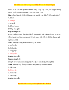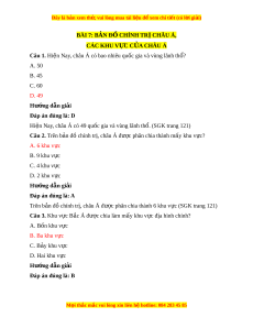ợ phân chia thành m y khu v ấ c? ự A. 6 khu v c ự B. 9 khu v c ự C. 4 khu v c ự D. 2 khu v c ự Hư ng d ớ ẫn gi i ả Đáp án đúng là: A Trên b n đ ả ồ chính tr , châu Á ị đư c phân chi ợ a thành 6 khu v c ( ự SGK trang 121) Câu 3. Khu v c ự B c ắ Á đư c chi ợ a làm m y khu v ấ c ự đ a ị hình chính? A. Bốn khu v c ự B. Ba khu v c ự C. B y ả khu v c ự D. Hai khu v c ự Hư ng d ớ ẫn gi i ả Đáp án đúng là: B M i