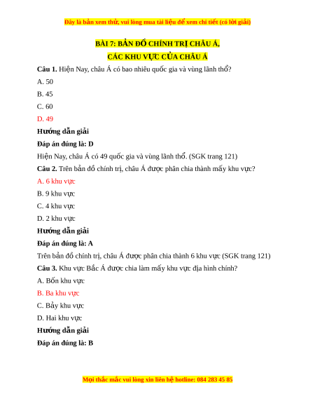 ay, châu Á có bao nhiêu qu c gi ố a và vùng lãnh th ? ổ A. 50 B. 45 C. 60 D. 49 Hư ng d ớ ẫn gi i ả Đáp án đúng là: D Hi n N ệ ay, châu Á có 49 qu c gi ố a và vùng lãnh th . ( ổ SGK trang 121) Câu 2. Trên b n ả đồ chính tr , châu Á ị đư c