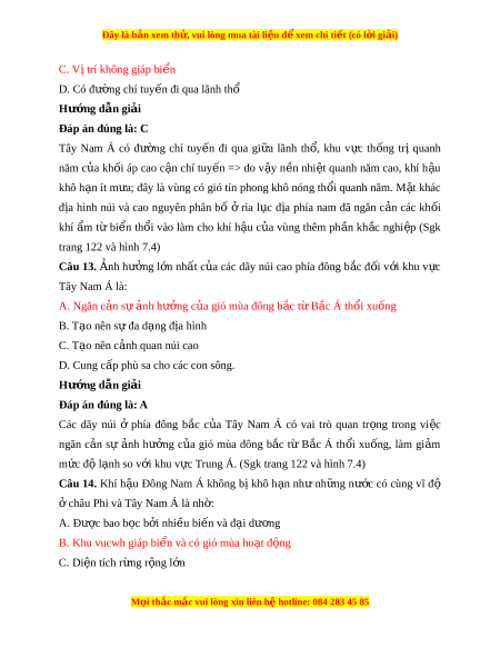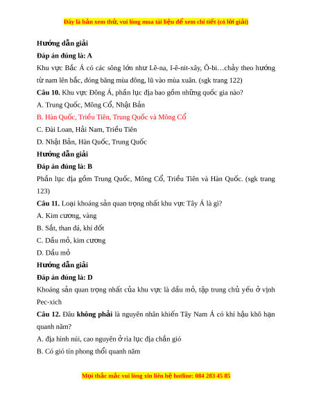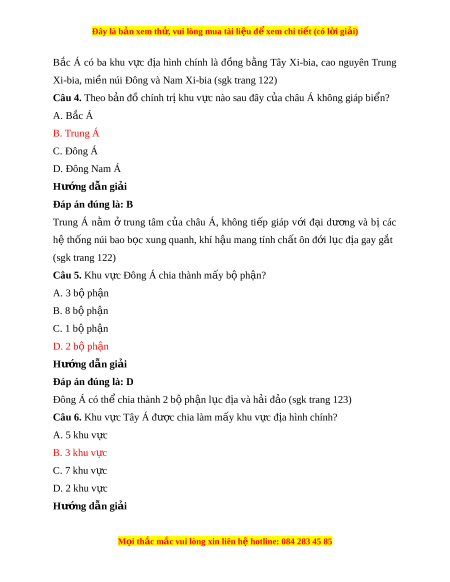 Đây là bản xem th , vu ử i lòng mua tài li u ệ đ xe ể m chi ti t (c ế ó l i ờ gi i ả ) Đáp án đúng là: B Tây Á có ba khu v c ự đ a ị hình chính: các s n ơ nguyên bán đ ở o ả - Ả r p, đ ậ ng b ồ ng ằ Lư ng H ỡ à và mi n ề núi cao. (sgk trang 123) Câu 7. Khu v c