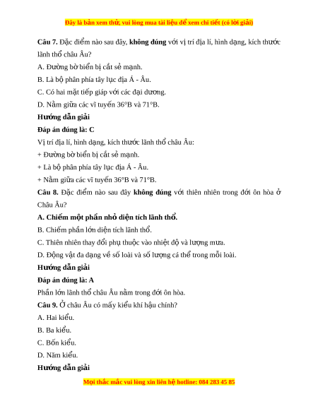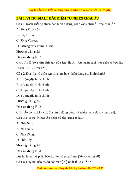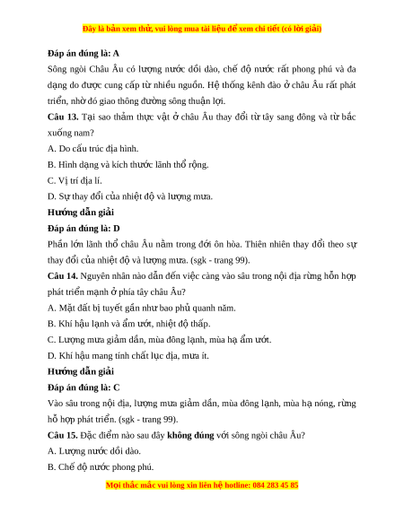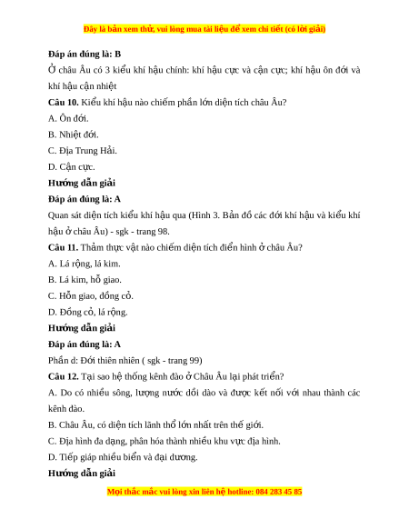 Đây là bản xem th , vu ử i lòng mua tài li u ệ đ xe ể m chi ti t (c ế ó l i ờ gi i ả ) Đáp án đúng là: B Ở châu Âu có 3 ki u ể khí h u ậ chính: khí h u ậ c c ự và c n ậ c c; ự khí h u ậ ôn đ i ớ và khí h u ậ c n nhi ậ t ệ Câu 10. Ki u khí ể h u ậ nào chi m ế ph n l ầ n di ớ n t ệ ích châu Âu? A. Ôn đ i ớ . B. Nhi t ệ đ i ớ . C. Địa Trung H i ả . D. C n c ậ c. ự Hư ng d ớ ẫn gi i ả Đáp án đúng là: A Quan sát di n ệ tích ki u ể khí h u ậ qua (Hình 3. B n ả đ ồ các đ i ớ khí h u ậ và ki u ể khí h u ậ châu  ở u) - sgk - trang 98. Câu 11. Th m ả th c v ự t ậ nào chi m ế di n t ệ ích đi n ể hình châu  ở u? A. Lá r ng, l ộ á kim. B. Lá kim, h gi ỗ ao. C. Hỗn giao, đ ng c ồ . ỏ D. Đồng c , ỏ lá r ng. ộ Hư ng d ớ ẫn gi i ả Đáp án đúng là: A Ph n d: ầ Đ i