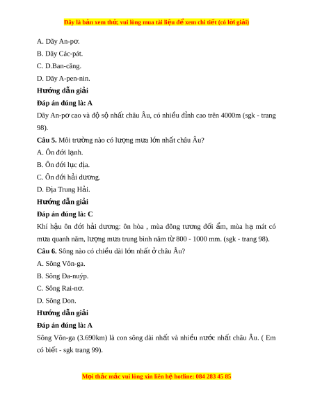 Đây là bản xem th , vu ử i lòng mua tài li u ệ đ xe ể m chi ti t (c ế ó l i ờ gi i ả ) A. Dãy An-p . ơ B. Dãy Các-pát. C. D.Ban-căng. D. Dãy A-pen-nin. Hư ng d ớ ẫn gi i ả Đáp án đúng là: A Dãy An-pơ cao và đ ộ s ộ nh t ấ châu Âu, có nhi u ề đ nh