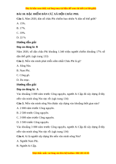 Câu 1. Năm 2020, dân số châu Phi chi m ế bao nhiêu % dân s t ố h gi ế i ớ ? A. 15%. B. 17%. C. 19%. D. 22 % Hư ng ớ d n gi ẫ i ả Đáp án đúng là: B