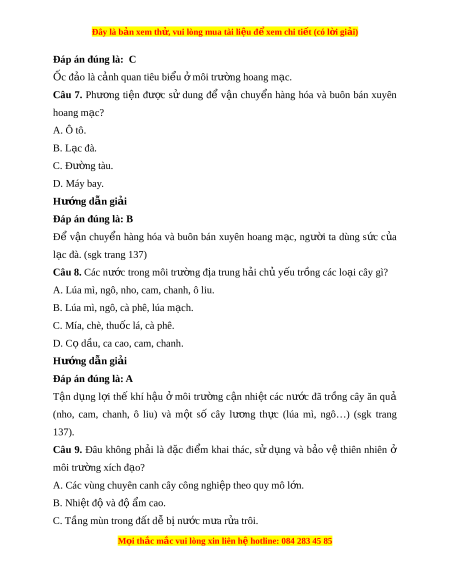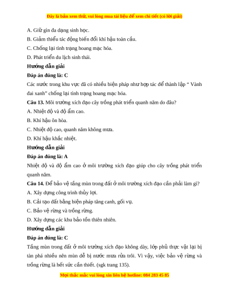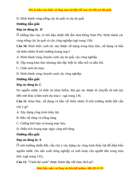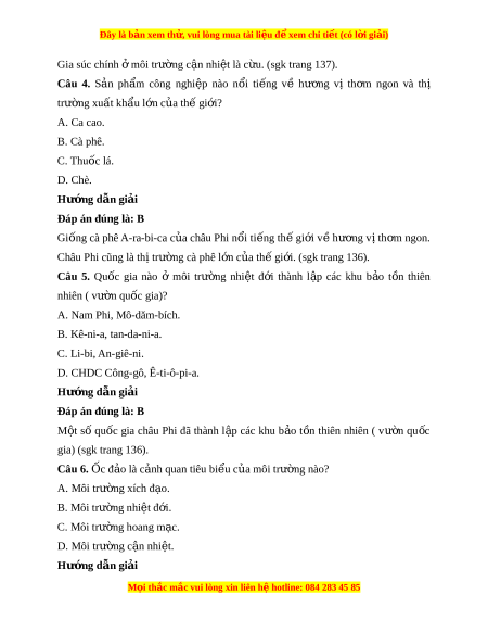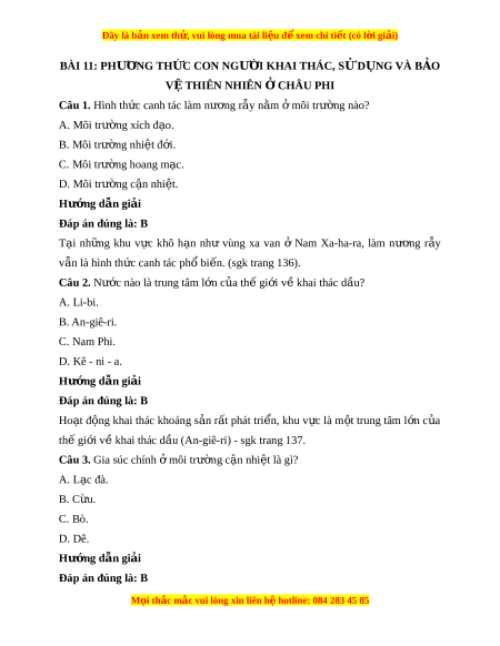 Đây là bản xem th , vu ử i lòng mua tài li u ệ đ xe ể m chi ti t (c ế ó l i ờ gi i ả ) BÀI 11: PHƯ N Ơ G TH C Ứ CON NGƯ I Ờ KHAI THÁC, S D Ử N Ụ G VÀ B O Ả VỆ THIÊN NHIÊN C Ở HÂU PHI Câu 1. Hình th c ứ canh tác làm nư ng ơ r y n ẫ m ằ m ở ôi trư ng nào? ờ A. Môi trư ng ờ xích đ o. ạ B. Môi trư ng nhi ờ t ệ đ i ớ . C. Môi trư ng hoang m ờ c. ạ D. Môi trư ng ờ c n nhi ậ t ệ . Hư ng d ớ ẫn gi i ả Đáp án đúng là: B T i ạ nh ng ữ khu v c ự khô h n
