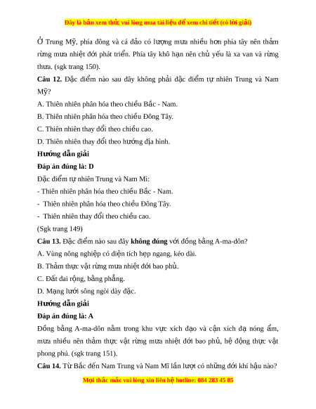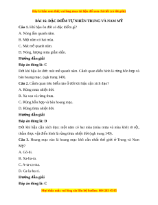 Ể TỰ NHIÊN TRUNG VÀ NAM MỸ Câu 1. Khí h u ậ ôn đ i ớ có đ c ặ đi m ể gì? A. Nóng ẩm quanh năm. B. M t ộ năm có hai mùa. C. Mát m quanh năm ẻ . D. Nóng, lư ng ợ m a gi ư m ả d n. ầ Hư ng d ớ ẫn gi i ả Đáp án đúng là: C Đ i ớ khí h u ậ ôn đ i ớ : mát m ẻ quanh năm. C nh ả quan đi n ể hình là r ng ừ hôn h p ợ và bán hoang m c. ( ạ sgk trang 149). Câu 2. C nh quan t ả iêu bi u nào ể đ ở i ớ khí h u c ậ n xí ậ ch đ o? ạ A. R ng ừ m a nhi ư t ệ đ i ớ . B. Xa van và r ng t ừ h a. ư C. R ng h ừ ỗn h p và bán ợ hoang m c. ạ D. R ng ừ th a nhi ư t ệ đ i ớ . Hư ng d ớ ẫn gi i ả Đáp án đúng là: D Đ i ớ khí h u ậ c n ậ xích đ o: ạ m t