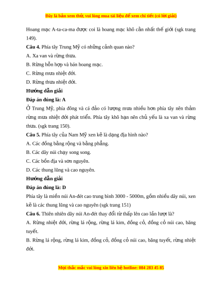 Câu 4. Phía tây Trung Mỹ có nh ng c ữ nh ả quan nào? A. Xa van và r ng t ừ h a. ư B. R ng h ừ ỗn h p và bán ợ hoang m c. ạ C. R ng m ừ a ư nhi t ệ đ i ớ . D. R ng ừ th a nhi ư t ệ đ i ớ . Hư ng d ớ ẫn gi i ả Đáp án đúng là: A Ở Trung M , ỹ phía đông và cá đ o ả có lư ng ợ m a ư nhi u ề h n ơ phía tây nên th m ả r ng ừ m a ư nhi t ệ đ i ớ phát tri n. ể Phía tây khô h n ạ nên chủ y u ế là xa van và r ng ừ th a. ư (sgk trang 150). Câu 5. Phía tây c a ủ Nam Mỹ xen k l ẽ à d ng đ ạ a hì ị nh nào? A. Các đồng b ng r ằ ng và b ộ ng ằ ph ng. ẳ B. Các dãy núi ch y s ạ ong song. C. Các bồn đ a và s ị n ơ nguyên.