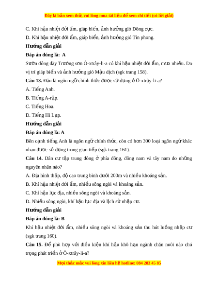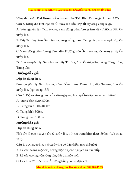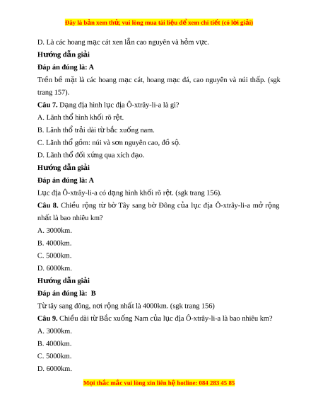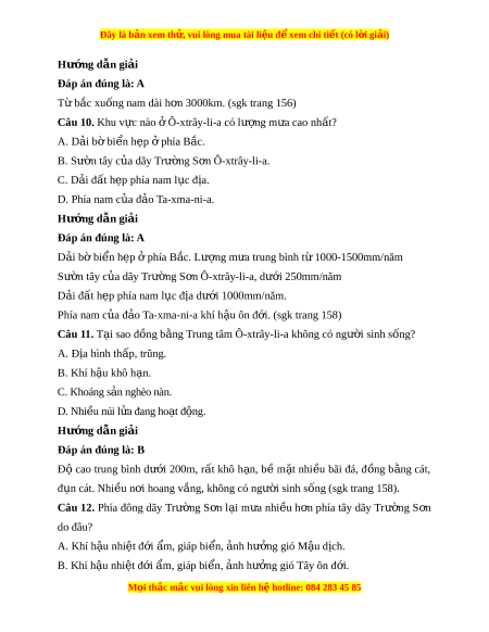 Đây là bản xem th , vu ử i lòng mua tài li u ệ đ xe ể m chi ti t (c ế ó l i ờ gi i ả ) Hư ng d ớ ẫn gi i ả Đáp án đúng là: A T b ừ c ắ xuống nam dài h n ơ 3000km. (sgk trang 156) Câu 10. Khu v c ự nào Ô ở -xtrây-li-a có lư ng m ợ a cao ư nh t ấ ? A. D i ả b bi ờ n h ể p ẹ phí ở a B c. ắ B. Sư n t ờ ây c a ủ dãy Trư ng S ờ n Ô ơ -xtrây-li-a. C. D i ả đ t ấ h p phí ẹ a nam l c đ ụ a. ị D. Phía nam c a ủ đ o ả Ta-xma-ni-a. Hư ng d ớ ẫn gi i ả Đáp án đúng là: A D i ả b bi ờ n h ể p ẹ phí ở a B c. L ắ ư ng m ợ a ư trung bình t 1000- ừ 1500mm/năm Sư n ờ tây c a dãy ủ Trư ng S ờ n Ô ơ -xtrây-li-a, dư i ớ 250mm/năm D i ả đ t ấ h p phí ẹ a nam l c ụ đ a ị dư i ớ 1000mm/năm. Phía nam c a ủ đ o