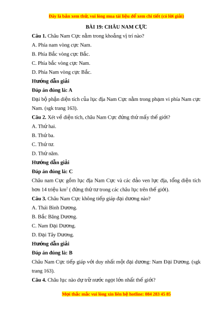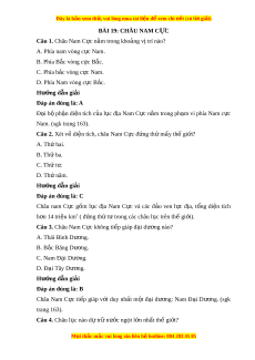 Đây là bản xem th , vu ử i lòng mua tài li u ệ đ xe ể m chi ti t ế (có l i ờ gi i ả ) BÀI 19: CHÂU NAM C C Ự Câu 1. Châu Nam C c n ự m ằ trong kho ng ả v t ị rí nào? A. Phía nam vòng c c N ự am. B. Phía B c vòng c ắ c ự B c. ắ C. Phía b c ắ vòng c c N ự am. D. Phía Nam vòng c c B ự c. ắ Hư ng ớ d n gi ẫ i ả Đáp án đúng là: A Đ i ạ bộ ph n di ậ ện tích c a l ủ c ụ đ a N ị am C c n ự m ằ trong ph m ạ vi phía Nam c c ự Nam. (sgk trang 163). Câu 2. Xét v di ề n t