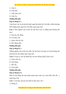 ớ đây, loài nào không s ng ố N ở am C c? ự A. Chim cánh c t ụ . B. Gấu tr ng. ắ C. H i ả cẩu. D. Chim bi n. ể Hư ng ớ d n gi ẫ i ả Đáp án đúng là: B M t ộ số loài đ ng ộ v t ậ ch u ị đư c ợ l nh ạ (chim cánh c t ụ , chim bi n, ể h i ả c u… ẩ ) (sgk trang 164). Câu 7. Loài th c ự v t ậ nào tiêu bi u ể ở châu Nam C c? ự A. Đồng c . ỏ M i ọ thắc m c