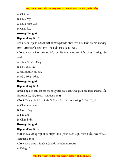 Đây là bản xem th , vu ử i lòng mua tài li u ệ đ xe ể m chi ti t ế (có l i ờ gi i ả ) A. Châu Á. B. Châu M . ỹ C. Châu Nam C c. ự D. Châu Âu. Hư ng ớ d n gi ẫ i ả Đáp án đúng là: C Châu Nam C c ự là n i ơ d ự tr ữ nư c ớ ng t ọ l n ớ nh t ấ trên Trái Đ t ấ , chi m ế kho ng ả 60% lư ng ợ nư c ng ớ t ọ trên Trái Đ t ấ . (sgk trang 164).