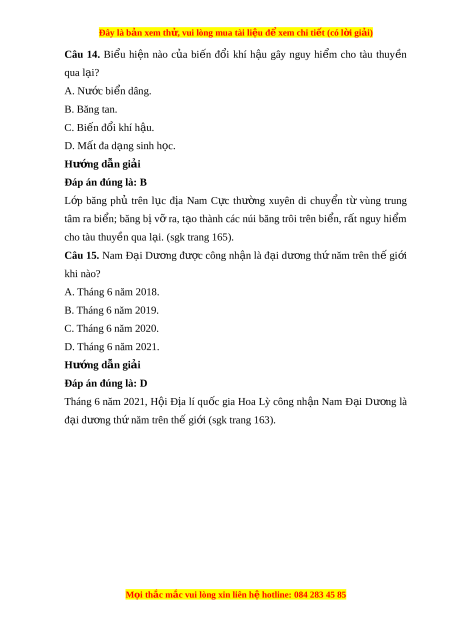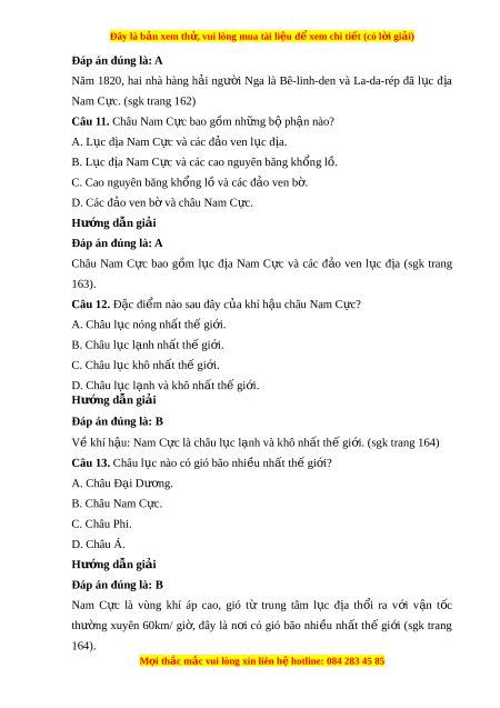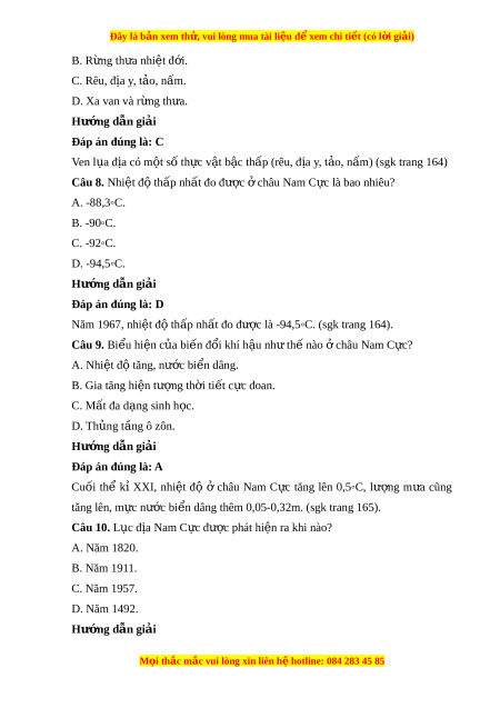 Đây là bản xem th , vu ử i lòng mua tài li u ệ đ xe ể m chi ti t ế (có l i ờ gi i ả ) B. R ng ừ th a nhi ư t ệ đ i ớ . C. Rêu, đ a y ị , t o, n ả m ấ . D. Xa van và r ng t ừ h a. ư Hư ng ớ d n gi ẫ i ả Đáp án đúng là: C Ven l a đ ụ ịa có m t ộ số th c v ự t ậ b c t ậ h p ( ấ rêu, đ a y ị , t o, ả n m ấ ) (sgk trang 164) Câu 8. Nhi t ệ đ t ộ hấp nhất đo đư c ợ châu N ở am C c l ự à bao nhiêu? A. -88,3◦C. B. -90◦C. C. -92◦C. D. -94,5◦C. Hư ng ớ d n gi ẫ i ả Đáp án đúng là: D Năm 1967, nhi t ệ đ t ộ h p nh ấ t ấ đo đư c