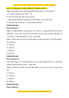 Ể TỰ NHIÊN CHÂU Á Câu 1. Đặc đi m ể nào sau đây không ph i ả là đ c đi ặ m ể v t ị rí c a ủ châu Á? A. Là m t ộ b ph ộ n ậ c a l ủ c ụ đ a ị Á - Âu B. Kéo dài t c ừ c ự B c ắ đ n vùng xí ế ch đ o ạ C. Đ i ạ b ph ộ n ậ di n t ệ ích n m ằ gi a chí ữ tuy n ế B c ắ và chí tuy n N ế am D. Ti p ế giáp v i ớ 2 châu l c và ụ 3 đ i ạ dư ng r ơ ng l ộ n ớ Hư ng d ớ ẫn gi i ả Đáp án đúng là: C Châu Á là m t ộ bộ ph n ậ c a ủ l c ụ đ a