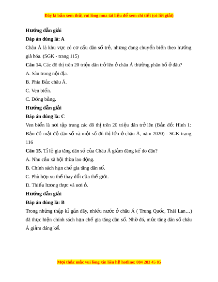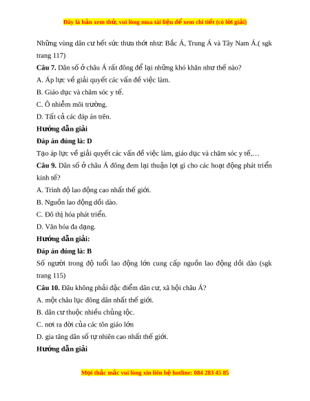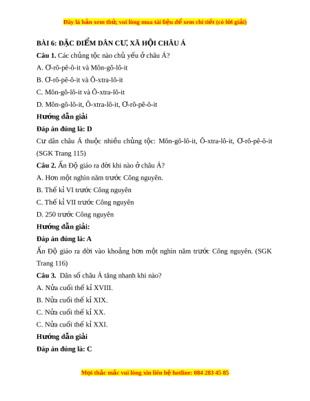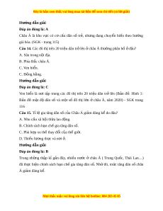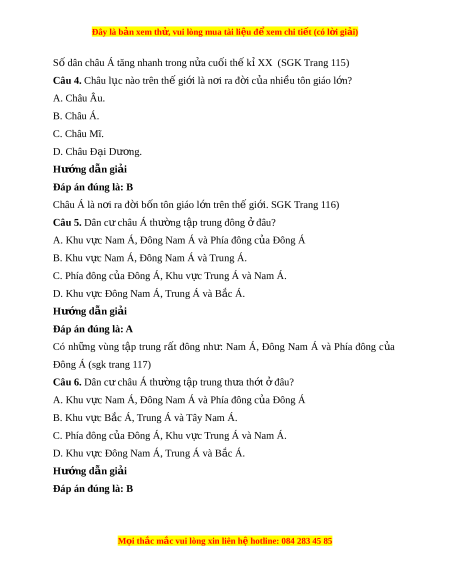 Câu 4. Châu l c nào t ụ rên th gi ế i ớ là n i ơ ra đ i ờ c a ủ nhi u t ề ôn giáo l n? ớ A. Châu Âu. B. Châu Á. C. Châu Mĩ. D. Châu Đ i ạ Dư ng. ơ Hư ng d ớ ẫn gi i ả Đáp án đúng là: B Châu Á là n i ơ ra đ i ờ b n t ố ôn giáo l n t ớ rên th gi ế i ớ . SGK Trang 116) Câu 5. Dân c châu Á ư thư ng ờ t p t ậ rung đông đâu? ở A. Khu v c