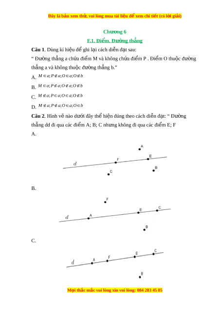 Câu 1. Dùng kí hi u đ ệ ghi ể l i ạ cách di n ễ đ t ạ sau: “ Đư ng t ờ h ng ẳ a ch a đi ứ m ể M và không ch a đi ứ m ể P . Đi m ể O thu c ộ đư ng ờ th ng ẳ a và không thu c ộ đư ng t ờ h ng ẳ b.” A. M ;