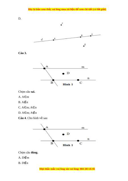 Đây là bản xem th , vu ử i lòng mua tài li u ệ đ xe ể m chi ti t ế (có l i ờ gi i ả ) D. Câu 3. Ch n câu ọ sai. A. A∈m B. A∉n C. A∈m; A∈n D. A∈m; A∉n