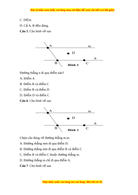 Câu 5. Cho hình vẽ sau Đư ng t ờ h ng ẳ n đi qua đi m ể nào? A. Đi m ể A B. Đi m ể B và đi m ể C C. Đi m ể B và đi m ể D D. Đi m ể D và đi m ể C