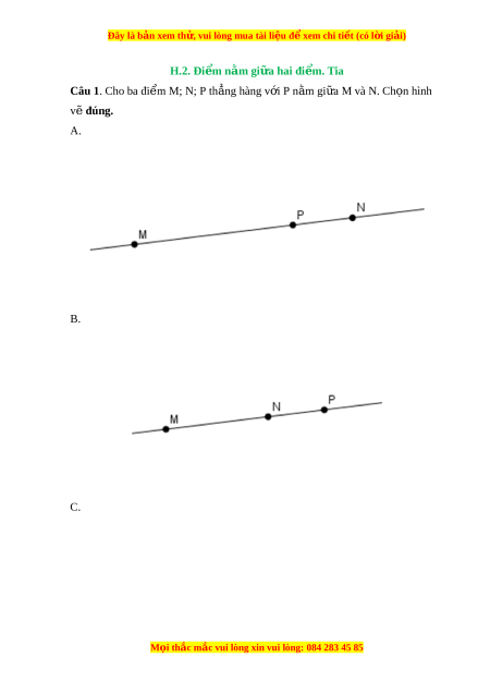 Đây là bản xem th , vu ử i lòng mua tài li u ệ đ xe ể m chi ti t ế (có l i ờ gi i ả ) H.2. Đi m ể nằm gi a hai ữ đi m ể . Tia Câu 1. Cho ba đi m ể M; N; P th ng hàng v ẳ i ớ P n m ằ gi a ữ M và N. Ch n hì ọ nh vẽ đúng. A. B. C. M i