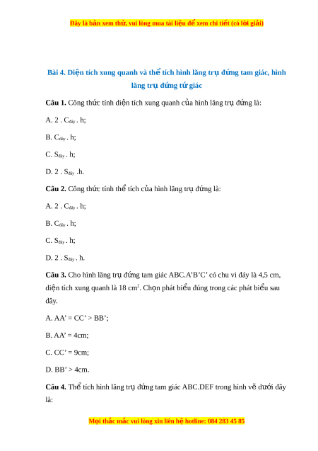 ể ích hình lăng tr đ ụ ng t ứ am giác, hình lăng tr đ ụ ng t ứ gi ứ ác Câu 1. Công th c t ứ ính di n t ệ ích xung quanh c a ủ hình lăng tr đ ụ ng ứ là: A. 2 . Cđáy . h; B. Cđáy . h; C. Sđáy . h; D. 2 . Sđáy .h. Câu 2. Công th c t ứ ính th t ể ích c a ủ hình lăng trụ đ ng l ứ à: A. 2 . Cđáy . h; B. Cđáy . h; C. Sđáy . h; D. 2 . Sđáy . h.