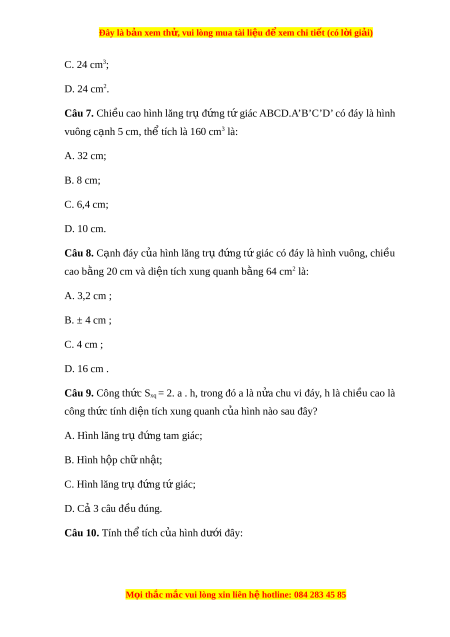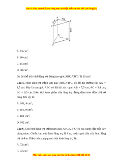 Đây là bản xem th , vu ử i lòng mua tài li u ệ đ xe ể m chi ti t ế (có l i ờ gi i ả ) C. 24 cm3; D. 24 cm2. Câu 7. Chi u cao ê hình lăng tr đ ụ ng t ứ