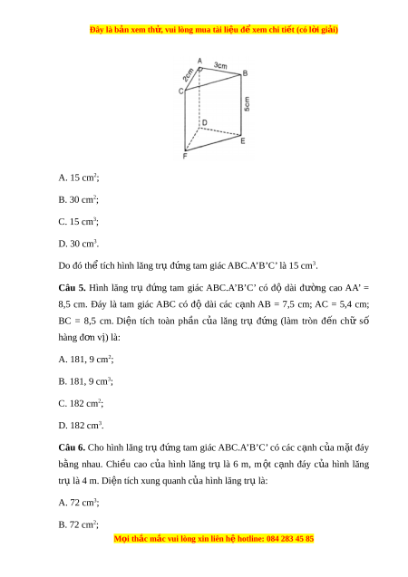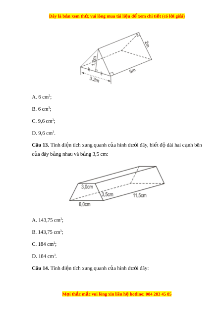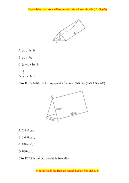 Đây là bản xem th , vu ử i lòng mua tài li u ệ đ xe ể m chi ti t ế (có l i ờ gi i ả ) A. a . c . h . b; B. a . h . b; C. (a + c + h) . b; 1 D. 2 . a . h . b. Câu 11. Tính di n t ệ ích xung quanh c a ủ hình dư i ớ đây (bi t ế AB = AC): A. 2 640 cm2; B. 2 640 cm3; C. 836 cm2; D. 836 cm3. Câu 12. Tính th t ể ích c a ủ hình dư i ớ đây: M i ọ thắc m c